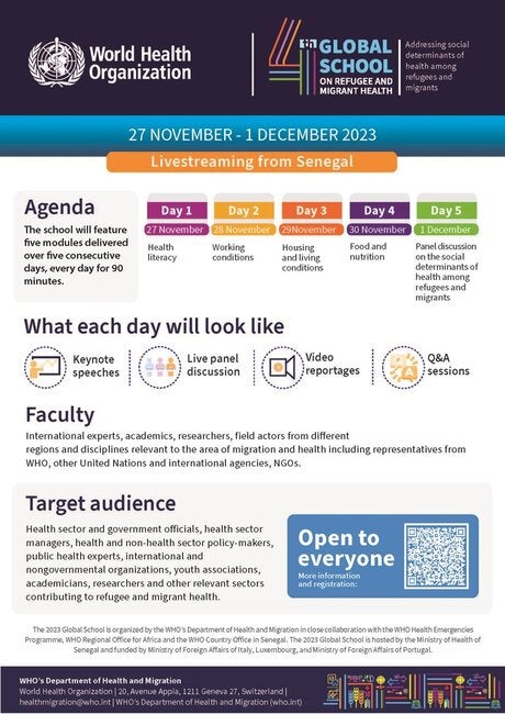 The fourth edition of the WHO Global School on Refugee and Migrant Health will focus on “Addressing social determinants of health among refugees and migrants." Organized by the WHO’s Department of Health and Migration in close collaboration with the WHO Health Emergencies Programme, WHO Regional Office for Africa and the WHO Country Office in Senegal and hosted by the Ministry of Health of Senegal, the five-day e-learning event will take place from 27 November to 1 December 2023, every day between 12:00-1:30 PM CET and be web streamed from Dakar, Senegal.