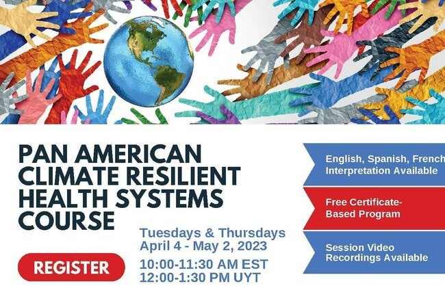 Health systems, including hospitals, are on the frontlines of climate change, bearing the costs of increasing disease burdens and more frequent extreme weather events while simultaneously inadvertently contributing to negative environmental and climate-related impacts. The goal of this course is to equip federal, regional and local health systems planners, hospital administrators, long-term care/community care professionals, emergency planners, sustainability officers, public health officials, health practitioners, and others with the knowledge and tools needed to prepare for climate change. This includes how to apply best practices to assess health system vulnerabilities and adaptation options, measure and monitor the climate resilience and environmental sustainability of health systems, and undertake health system greening, all while integrating health equity and undertaking broad stakeholder engagement. Health Canada, the Pan American Health Organization, the Inter-American Institute for Global Change Research (IAI) and the Global Consortium on Climate and Health Education have co-organized this course, with input from Ministries of Health and Environment and civil-society climate and health practice communities throughout the Americas.