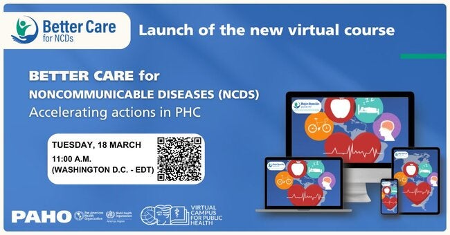 Join us on Tuesday, March 18, 2025, at 11:00 a.m. (EDT - Washington, DC time) for the launch of the virtual course "Better Care for Noncommunicable Diseases." The webinar is primarily aimed at primary care health teams, including physicians, nurses, health promoters, community workers, and other professionals responsible for the prevention, detection, and management of NCDs in PHC services. It is also open to health policymakers, NCD program managers, academics, civil society representatives, and researchers, who play a key role in the implementation and scalability of PHC strengthening strategies in the Region.