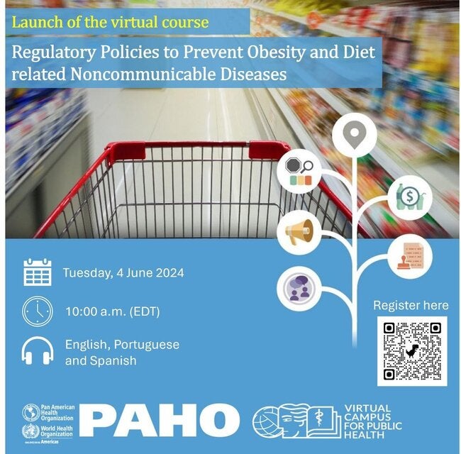 Join us on Tuesday, June 4, 2024, at 10:00 a.m. (Washington DC, or EDT) for the launch event for the self-learning virtual course on Regulatory Policies to Prevent Obesity and Diet-related Noncommunicable Diseases. In this course, participants will gain access to strategies for designing and advancing regulatory policies that reduce the demand and offer of ultra-processed and processed products and can halt the rise of obesity and diet-related non-communicable diseases (NCDs).