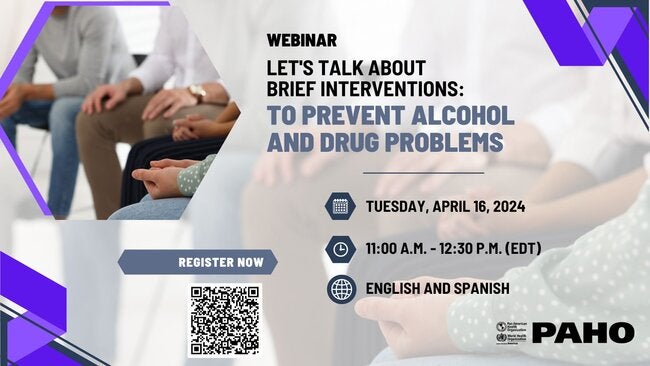 Join us on Tuesday, April 16, 2024 at 11:00 a.m. (Washington D.C. or EDT) at the webinar: Let's talk about brief interventions to prevent alcohol and drug problems. The purpose of this Webinar is to awaken and renew the interest of participants in the implementation of brief intervention models in alcohol and drugs, so that these interventions can become a tool for Primary Health Care and offer minimum conditions of counseling and support, for those who may be at risk or have problematic consumption of alcohol or drugs; additionally, it is intended to provide the minimum technical elements that facilitate the detection of those who may require a more complex intervention.