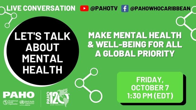 On Friday, October 7, at 13:00 pm (EDT), join us for the live session "Let's Talk About Mental Health: Make Mental Health and Well-Being for All a Global Priority", organized by PAHO as part of the activities for World Mental Health Day, which is held annually on October 10th.