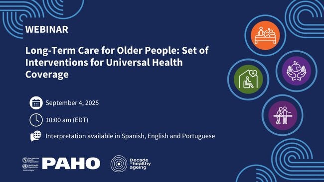 Join us for the webinar on “Long-Term Care for Older People: Set of Interventions for Universal Health Coverage" in the Americas. It will be a space to learn about the main contributions of the document and country experiences, engage in dialogue with regional experts, and collectively reflect on how to advance toward the creation of long-term care (LTC) structures that ensure dignity, equity, and well-being for all.