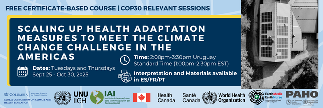 This online and free course is organized by the Pan American Health Organization (PAHO), the Global Consortium on Climate and Health Education (GCCHE) of the University of Columbia, the World Health Organization (WHO), the Inter-American Institute for Global Change Research (IAI), EarthMedic and EarthNurse Foundation for Planetary Health, International Institute for Global Health, United Nations University, and Health Canada.