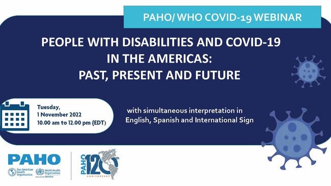 Join us in the webinar "People with disabilities and COVID-19 in the Americas: past, present and future", hosted by the Mental Health Unit at the Department of Noncommunicable Diseases and Mental Health on Tuesay, 1 November, from 10:00 a.m. to 12.00 p.m. (EDT). This virtual session, the first of a series of two -the second will take place on 7 December- will explore the the challenges, barriers and lessons learned, current situation and looking to the future for people with disabilities.