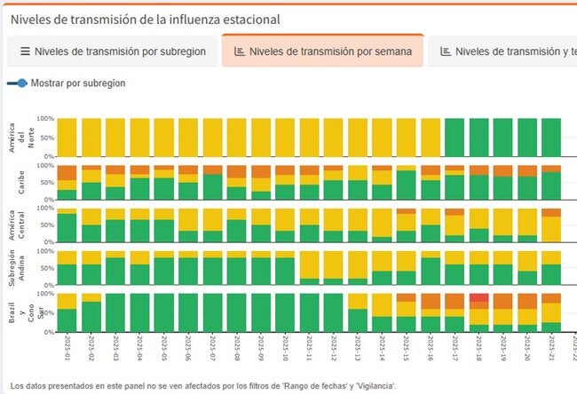 During the seminar, PAHO proposed expanding the use of PISA among countries that do not yet report regularly, by streamlining data processing and generating indicators that can feed into regional and global platforms. Dashboards displaying transmission levels by subregion and epidemiological week were presented to support real-time risk assessments.