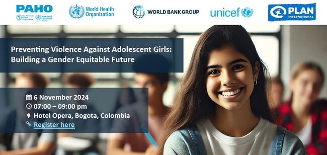 You are invited to participate in a conversation with the Pan American Health Organization, the World Health Organization, the World Bank, UNICEF, and Plan International on preventing violence against adolescent girls to build a gender-equitable future. The conversation will feature youth leaders and experts from governments, civil society, international agencies, and other key stakeholders. Join us on Wednesday, 6 November 2024, at 7:00 p.m. (Colombia time) to participate in the event "Preventing Violence Against Adolescent Girls: Building a Gender Equitable Future."
