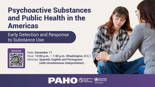 Join us on Thursday, December 11, at 12:00 p.m. (Washington, D.C. time or EST) for the event "Psychoactive Substances and Public Health in the Americas: Early Detection and Response to Substance Use". The event aims to present the most recent epidemiological evidence on the disease burden attributable to psychoactive substance use in the Americas and to strengthen the capacities of countries in the Region to address this issue at the primary care level through the implementation of validated tools such as ASSIST and AUDIT.
