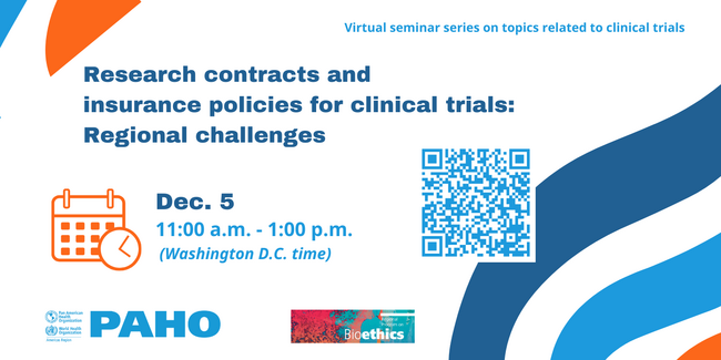 PAHO’s Regional Program on Bioethics and Quality and Regulation of Medicines and Health Technologies Unit invite you to participate in this series of virtual seminars that will address topics related to clinical trials. Many of these topics lie at the intersection of ethical and regulatory aspects.