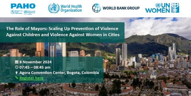 You are invited to participate in a conversation with the Pan American Health Organization, the World Health Organization, the World Bank, and UN Women on preventing violence against children and violence against women in cities. The conversation will feature mayors, experts from civil society, international agencies, and other key stakeholders. Join us on Friday, 8 November 2024, at 7:45 a.m. (Colombia time) to participate in the event "The Role of Mayors: Scaling Up Prevention of Violence Against Children and Violence Against Women in Cities."