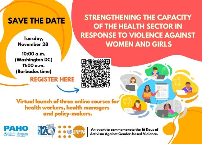 Join us on Tuesday, November 28, 2023, at 10:00 a.m. (EST) for the webinar Strengthening the Capacity of the Health Sector in Response to Violence Against Women and Girls, an event to launch three virtual courses for health workers, health managers, and policy-makers.
