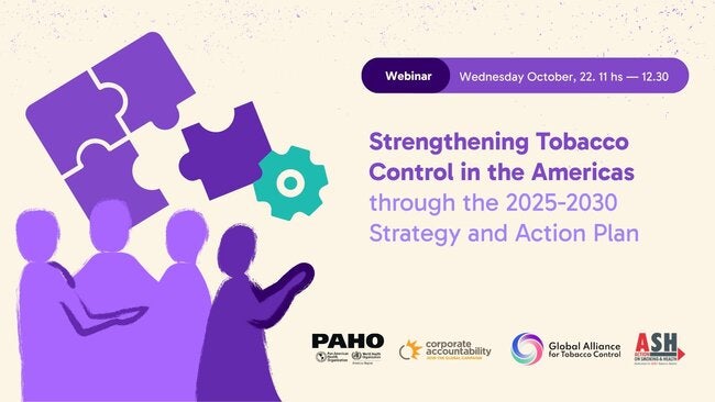 Join us on Wednesday, October 22, 2025, at 11:00 a.m. (Washington, DC time) for the webinar “Strengthening Tobacco Control in the Americas through the PAHO Strategy and Action Plan 2025–2030.” This 90-minute webinar will present the new Strategy and Action Plan approved by PAHO Member States in 2024, share national and regional experiences, and highlight civil society contributions to accelerate the implementation of the WHO FCTC and address both conventional and emerging tobacco and nicotine products.
