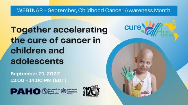 The Pan American Health Organization cordially invites you to the webinar "Together accelerating the cure of cancer in children and adolescents 2022" , that will take place on Wednesday, 21 September, 2022. This is an important event to disseminate the focus of the prioritized set of essential interventions comprised in the second pillar in the CUREALL technical package Universal coverage. This universal health coverage can reduce financial difficulties by including effective support services to facilitate access to health care for children and adolescents with Cancer.
