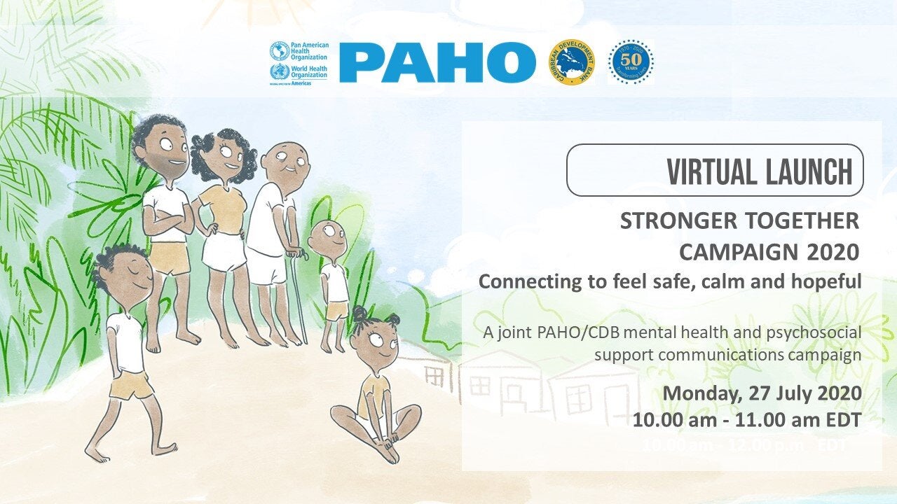 The Office of Subregional Program Coordination for the Caribbean (SPC), of the Pan American Health Organization (PAHO) and the Caribbean Development Bank (CBD) cordially invite you to the virtual launch of the Stronger Together Campaign 2020, on Monday, 27 July 2020, from 10.00 to 11.00 am (EDT).