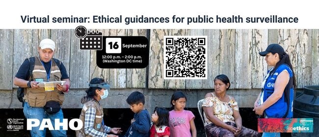 PAHO's Regional Program on Bioethics conducted this webinar, which covered WHO Guidelines on Ethical Issues in Public Health Surveillance (now also available in Portuguese, French, and Spanish) and discussed some prominent challenges in different aspects of surveillance work.