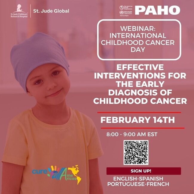 Join us on Friday, February 14, 2025, at 8:00 am (Washington DC time) on the webinar "Effective Interventions for the Early Diagnosis of Childhood Cancer," organized jointly by St. Jude Children´s Research Hospital and the Pan American Health Organization, to mark the International Childhood Cancer Day 2025. This event will highlight advances in the region related to timely childhood cancer diagnosis as part of the ongoing efforts within the framework of the WHO Global Initiative for Childhood Cancer.