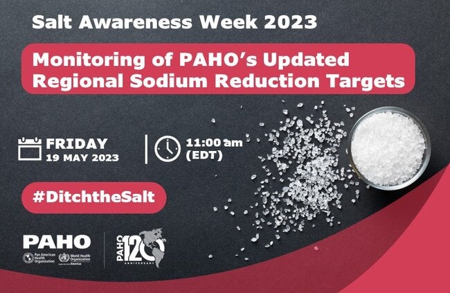 Join us on Friday, 19 May, in the webinar "Monitoring of PAHO’s Updated Regional Sodium Reduction Targets" as part of the activities of the Salt Awareness Week 2023 (15-21 May) #Ditch the Salt. The event will be broadcasted vía Zoom from 11:00 am to 1:00 pm (Washington DC time) and will have simultaneous translation in English, Spanish and Portuguese.