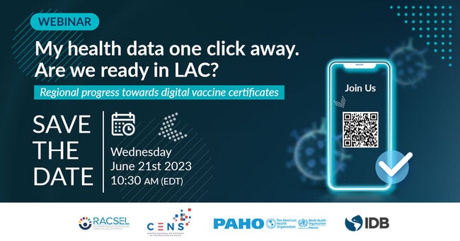 The Pan American Health Organization (PAHO), the Inter-American Development Bank (IDB) and the American Network for Cooperation on e-Health (RACSEL) in partnership with the National Center for Health Information Systems (CENS), within the framework of the Convergence of Cross-Border Interoperability Initiatives for Latin America and the Caribbean LACPASS and PAHO-DDCC invite you to the webinar "My health data one click away. Are we ready in LAC? Regional progress towards digital vaccine certificates", with the objective of discussing the progress of the Region on digital certificate issues and future challenges.