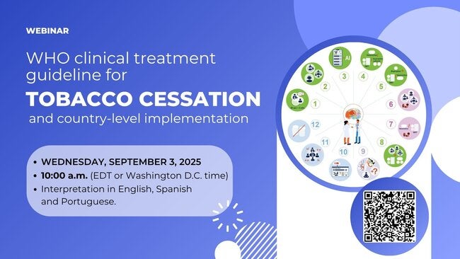 Join us on Wednesday, September 3, 2025, at 10:00 am (EDT) on the webinar WHO clinical treatment guideline for tobacco cessation and country-level implementation. In July 2024, WHO released its first-ever clinical treatment guideline for tobacco cessation in adults, providing a comprehensive set of technical guidance for WHO Member States to support 1.25 billion adult tobacco users to quit. This webinar engages policymakers, tobacco control staff, and tobacco cessation service providers and managers in discussing the guideline recommendations and country-level implementation.