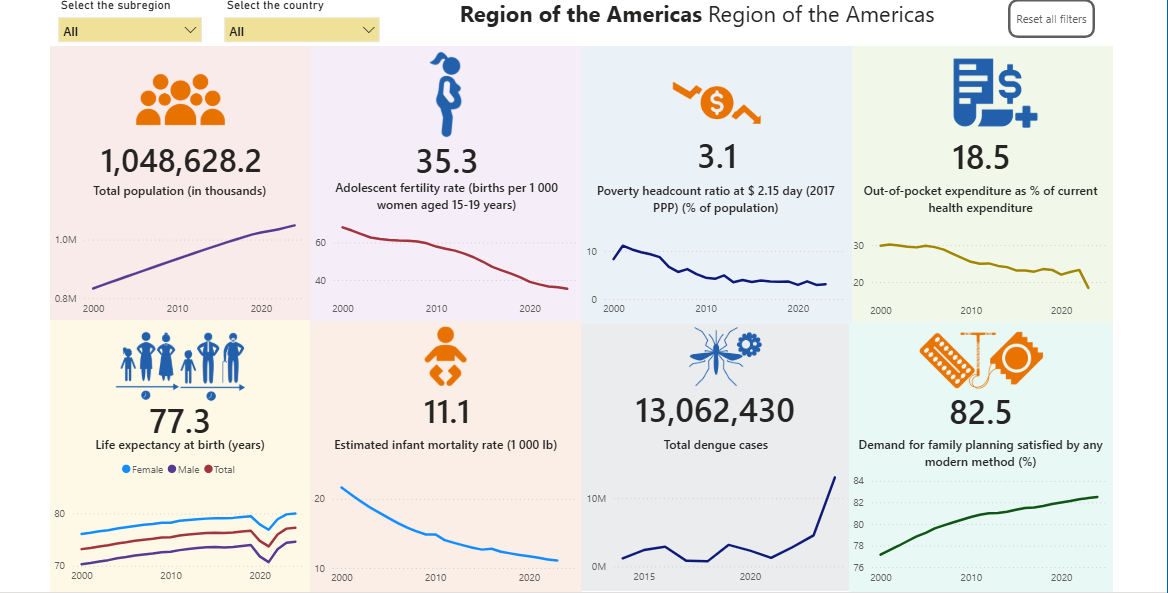 An interactive portal that presents more than 140 health and health-related indicators with data from 1995 to the present, including disaggregation by age, sex, urban-rural distribution, and more. It gives crucial information on the health situation and trends at the country, subregional, and regional levels.