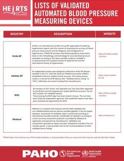 HEARTS in the Americas has identified that the issue of accuracy of blood pressure measurement is key to ensuring the advancement of the initiative as it is a crucial factor for the correct diagnosis and management of hypertension. Measuring blood pressure with non-validated equipment is a serious problem of quality of health services and a matter of patient safety. Therefore, it is working with countries on the use of correct measurement protocols, validation of automated blood pressure measuring devices, and strengthening regulatory frameworks to guarantee the exclusive use of validated devices.
