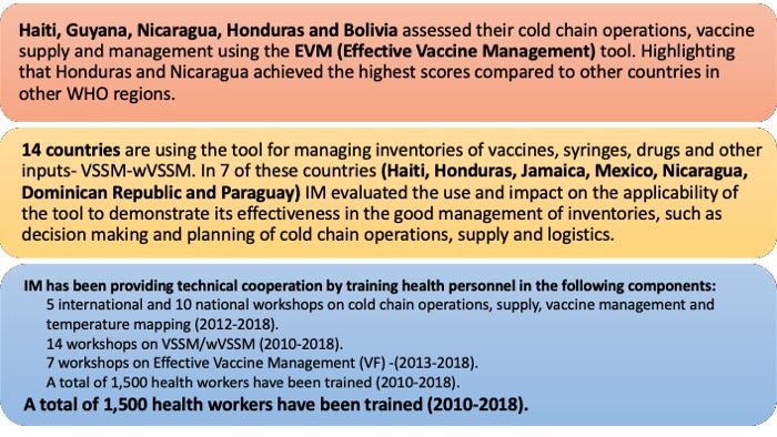 To assure that vaccines provide the expected benefits when a patient receives an immunization, epidemiologist and health staff understand that each dose of vaccine administered has to be potent for protecting the recipient against the targeted disease(s). To achieve this objective the Immunization Unit, in PAHO, focused on five pillars: