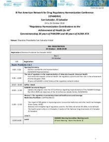 The latest conference, IX CPANDRH, was held in San Salvador, from October 24th - 26th, 2018 with the theme "Commemorating 20 years of PANDRH and 40 years of Alma-Ata. The contributions of regulatory harmonization on achieving Health for All".