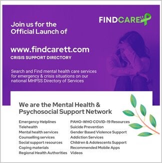12 January 2021- The MHPSS Network of Trinidad and Tobago launched its crisis support directory, www.findcarett.com, where Trinidadians can search for mental health care services for emergency and crisis situations. Services and resources available as part of the Directory include mental health and addiction services, counseling, gender-based violence support, services for children and adolescents, coping materials, videos, and mobile apps, among others.
