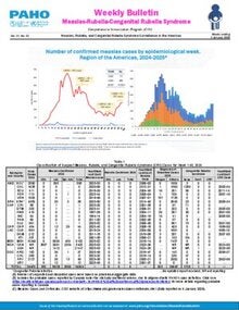 The measles, rubella and congenital rubella syndrome bulletin provides information on reported cases for these diseases and final diagnoses by country. Surveillance indicators are also monitored and published. This bulletin is prepared from weekly surveillance reports submitted by countries and is published every two weeks. The bulletin collects data since 1995.