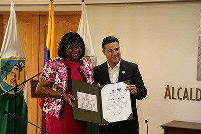 Medellín, Colombia, 1 December 2015 (PAHO/WHO) — Dr. Carissa F. Etienne, Director of the Pan American Health Organization/World Health Organization (PAHO/WHO), received the key to the city of Medellin from Mayor Anibal Gaviria today during a special ceremony in the mayor's office.