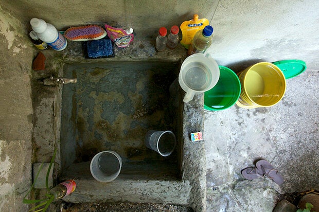 * Photo: A community health officer visits a house to educate the owner and check water storage to control mosquito breeding sites, Colombia. PAHO/WHO, J Dempster