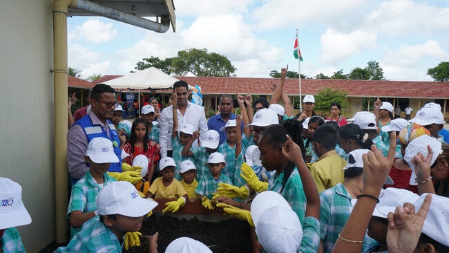 Group picture of excited students around the planter boxes with Minister of Health Dr. Amar Ramadhin and PAHO/WHO Suriname Health Systems and Services Advisor Dr. Rosmond Adams.