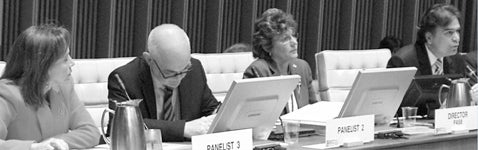 (L. to r.) PAHO Assistant Director Socorro Gross, WHO's Wim Van Lerbeghe, PAHO Director Mirta Roses, and 48th Directing Council President José Gomes Temporão, of Brazil. Photo by DavidSpitz/PAHO