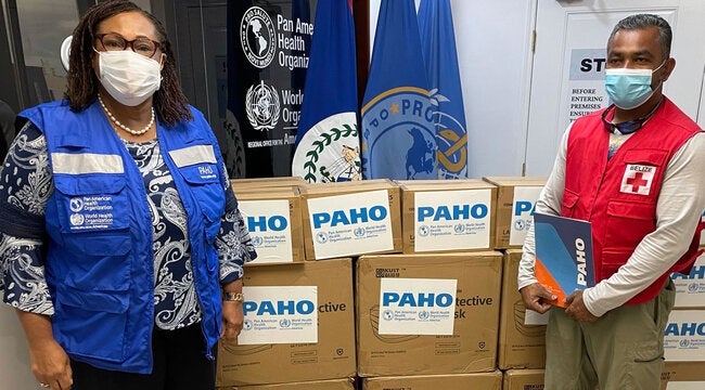 Belize City, Belize, December 21, 2020 (PAHO) – The Pan American Health Organization/World Health Organization (PAHO/WHO), as part of the continuous support in responding to the COVID-19 pandemic donated 30,280 Personal Protective Equipment (PPEs) to the Belize Red Cross. The Red Cross continues to be at the forefront of the battle to alleviate the distress of Belizeans after the recent disastrous flooding from hurricanes ETA and IOTA s and because of the COVID-19 pandemic. The PPEs are critical for keeping the members safe as they visit the communities.