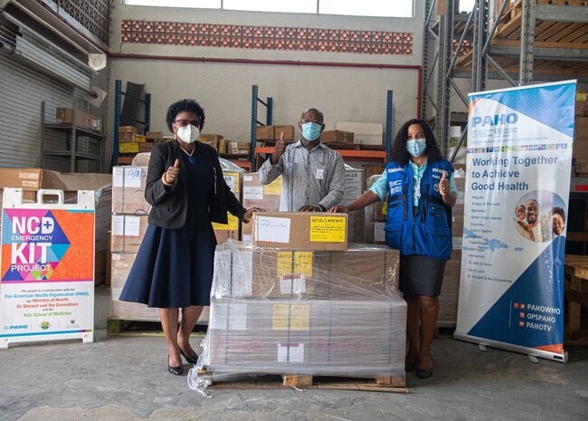 Upon arrival of the 3 full emergency kits in the country, the Ministry of Health had a ceremony in which Mr. Levi Walker thanked PAHO/WHO, Yale University School of Medicine and PCI: “These supplies have been made available to us, in St. Vincent and the Grenadines, at an opportune time, considering the exacerbation of health challenges in the aftermath of our recent volcanic eruptions. While the emphasis initially would have been on meeting the medication needs of persons who were displaced, we acknowledge the fact, and it is a desirable fact, that a wider cross-section of our NCD population will in fact benefit from having access to the components of the NCD Kits”.