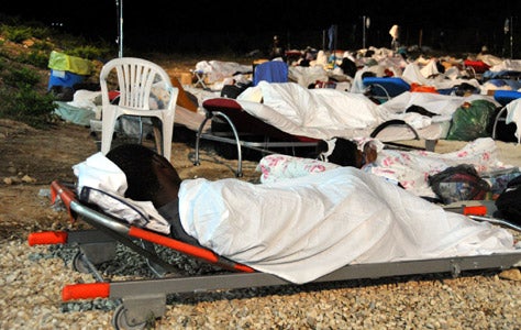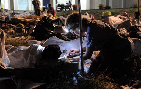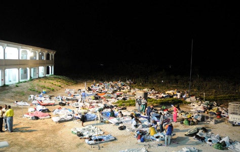 After a strong aftershock, patients from the El Buen Samaritano hospital in Jimaní (on the border of Dominican Republic and Haiti) left the building and spent the night outside, even though an evaluation has shown the building structure to be sound. Nerves are certainly frayed: a patient with a fractured lef jumped from the second floor, fracturing the other leg. (Photos PAHO/WHO Victor Hugo Ariscain)