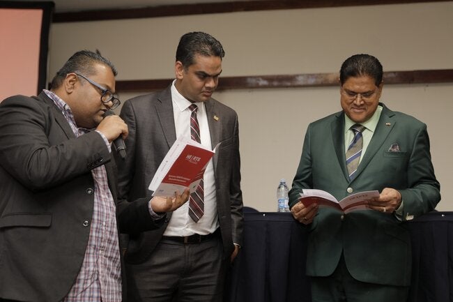 Deputy Director of Health Dr. Ritesh Dhanpat, Minister of Health Dr. Amar Ramadhin, and President Santokhi viewing the Chronic Care Passport.