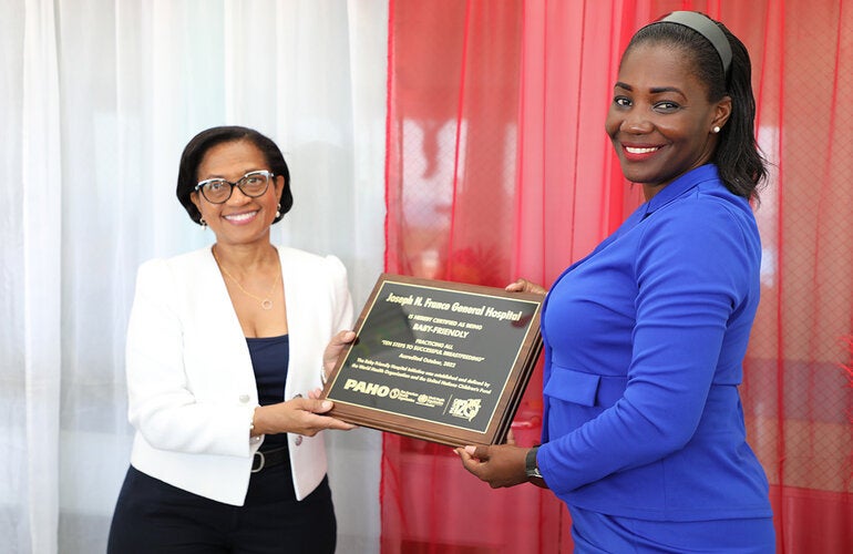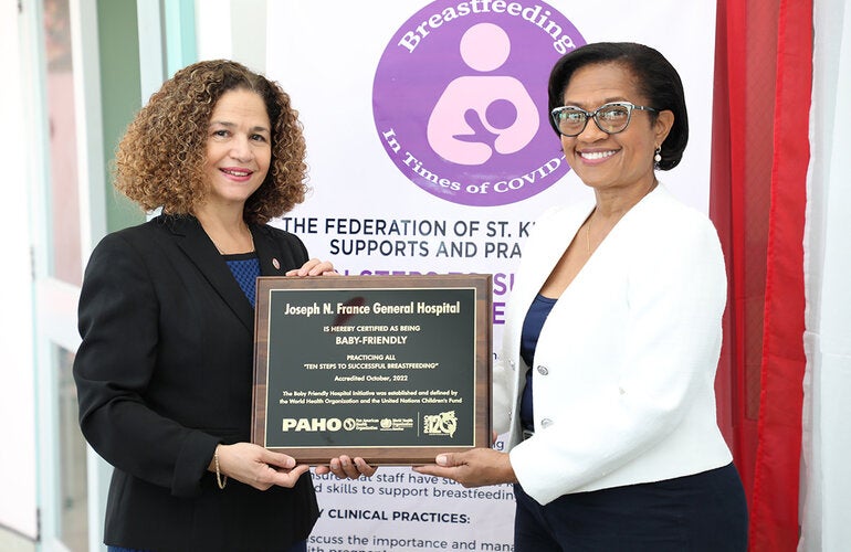 Basseterre, St. Kitts, 8 March 2023 (PAHO) - The Joseph Nathaniel France (JNF) General Hospital in St. Kitts and Nevis is now certified as being Baby-Friendly. Certification was granted in October 2022 and the official handing over of the plaque took place on 7 March 2023.