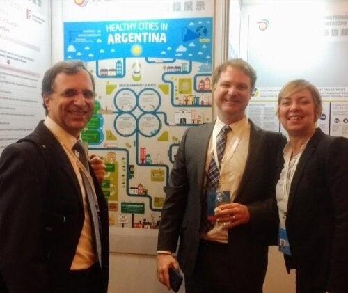 Dr. Alfonso Contreras (PAHO Regional Advisor on Health Promotion), Dr. Daniel Buss (PAHO Regional Advisor on Global Environmental Changes) & Dr. Kira Fortune (Interim Chief of PAHO SDE & Regional Advisor on Social Determinants of Health) pose in front of Argentina's poster at the 9th Global Conference on Health Promotion.