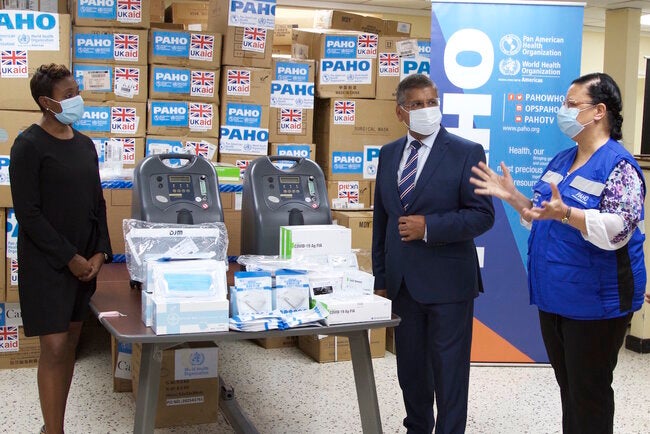 Kingston, Jamaica, Oct 26, 2020: The Pan American Health Organisation/ World Health Organisation (PAHO/WHO) in partnership with the UK Government, and the United Nations Multi-Partner Trust Fund have delivered over 80,000 antigen rapid diagnostic COVID-19 tests to the Ministry of Health and Wellness (MOHW) in a ceremony held today as part of a large COVID response package worth over $1 million USD that included nine oxygen concentrators and over 350,000 pieces of Personal Protective Equipment (PPE) consisting of N95 respirators, along with face shields and medical masks.