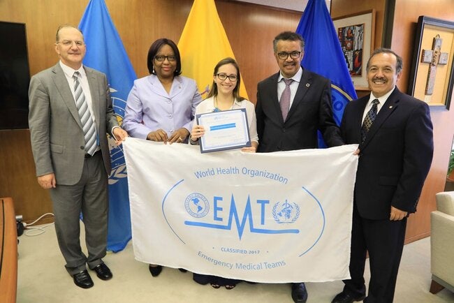 Washington, DC, September 26, 2017 (PAHO/WHO) - The emergency medical team of the Ministry of Public Health of Ecuador is the second in the Americas region to receive verification from the World Health Organization (WHO), as part of its Emergency Medical Team (EMT) initiative.