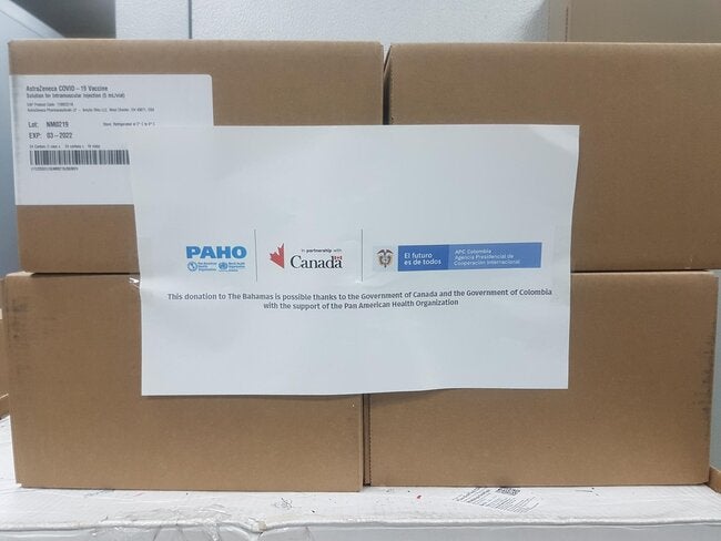 Nassau, Bahamas, 15 December 2021 [PAHO] — The Bahamas received 48,000 doses of AstraZeneca COVID-19 vaccines under a collaboration between the Pan American Health Organization/World Health Organization (PAHO/WHO) and the Governments of Canada and Colombia to increase vaccine access among for vulnerable populations in Latin America and the Caribbean.