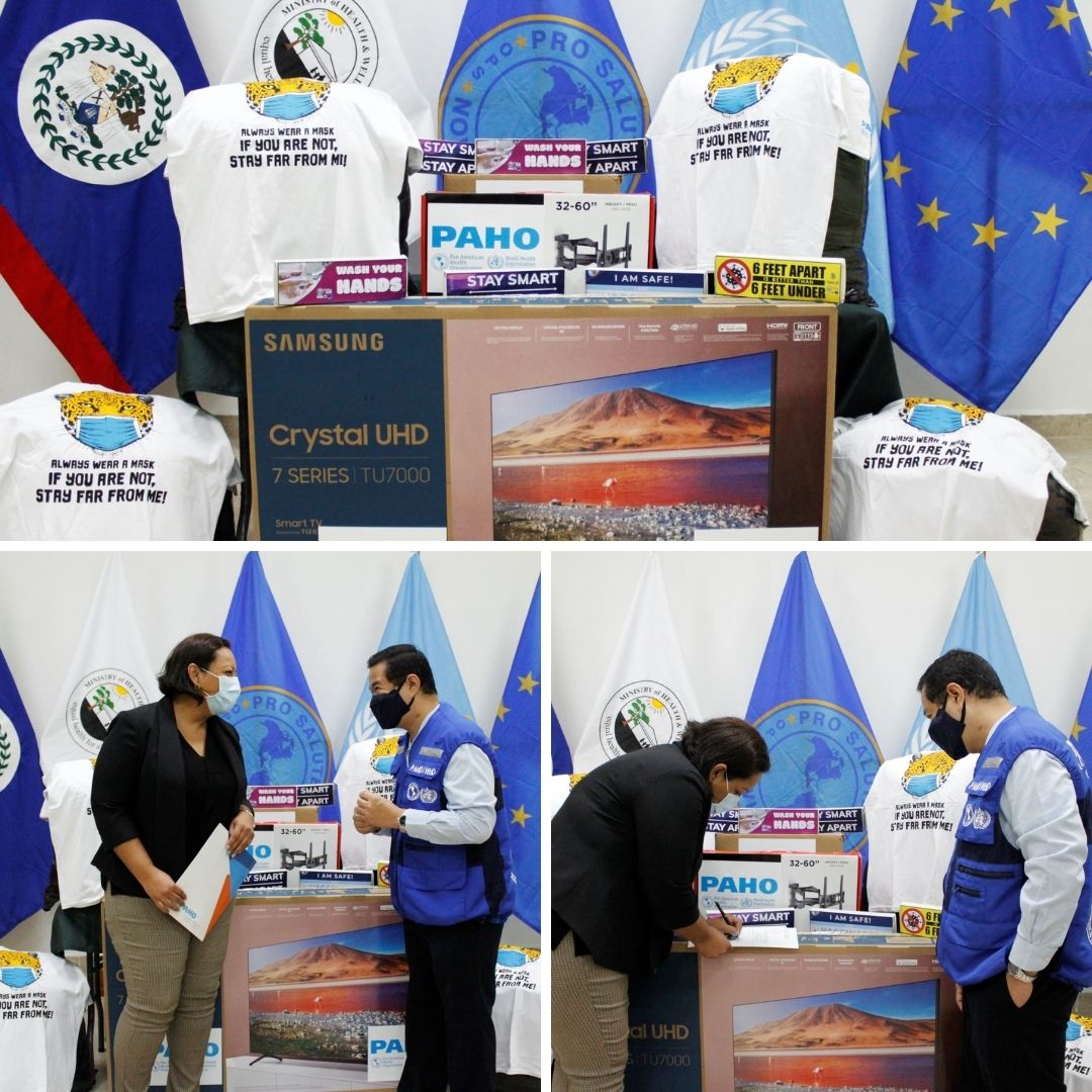 Belize City, Belize, July 29, 2021 (PAHO) – The Pan American Health Organization/World Health Organization (PAHO/WHO) handed over t-shirts, bumper stickers, and a Smart Samsung TV with mount as the Ministry of Health and Wellness (MoHW) intensifies its COVID-19 Vaccination Campaign – Before You Relax, Get Vax. This was made possible through generous funding support from the Government of Germany and the European Union (EU) under the Health Sector Support Programme (HSSP) Belize project.