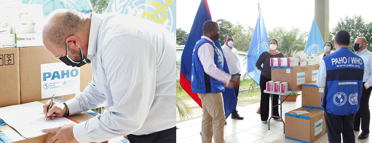 Belize City, Belize, January 5, 2021 (PAHO) – To support the ongoing efforts in expanding SARS-COV-2 testing strategies in Belize, the Pan American Health Organization/World Health Organization (PAHO/WHO) donated 49,975 SD Standard F COVID-19 Antigen FIA test kits, 45,000 SD Standard Q COVID-19 Antigen test kits along with seven (7) units of SD Standard COVID-19 Antigen Control, and two (2) units of Rapid Diagnostic Test Analyzers (RDT) to the Ministry of Health and Wellness.