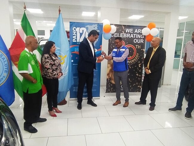 The official handover of the donation was formally done by PAHO/WHO’s Health Systems and Services Advisor, Dr. Rosmond Adams to the Minister of Health Dr. Amar Ramadhin at the Kersten Motors Toyota Dealer in the presence of Deputy Chief of Mission Mr. Priyadarshi Sen of the Embassy of the United States of America in Suriname.