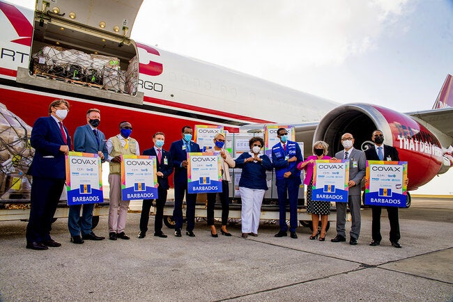 Bridgetown, Barbados, 06 April 2021 (PAHO / WHO) - Barbados today received 33,600 doses of COVID-19 vaccines through the COVAX Facility, a global effort between the Coalition for Epidemic Preparedness Innovations (CEPI), Gavi, the Vaccine Alliance, United Nations Children's Fund (UNICEF), the Pan American Health Organization (PAHO) and the World Health Organization (WHO).