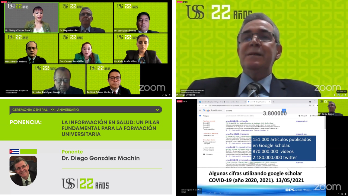On July 5, the Anniversary Ceremony of the Universidad Señor de Sipán, a Peruvian institution that this year celebrates its twenty-second anniversary, was held. The event's Magisterial Conference, held online, entitled “La información en salud: un pilar fundamental para la formación universitária” was performed by BIREME's director, Diego González Machín.