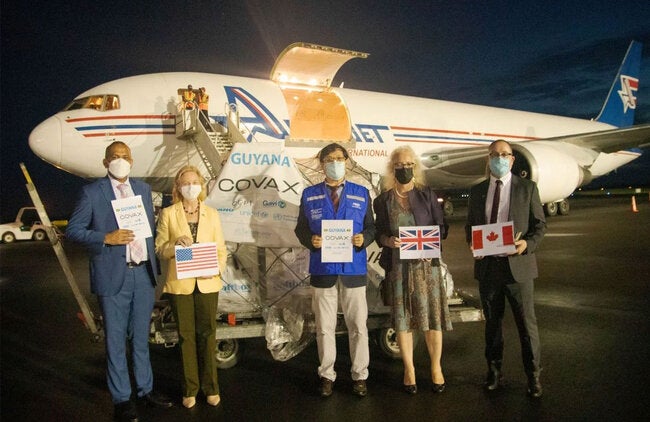 GEORGETOWN 6 December 2021 – Guyana received 42,120 Pfizer COVID-19 vaccine doses through the COVAX Mechanism Facility, a partnership between the Coalition for Epidemic Preparedness Innovations (CEPI), Gavi, the Vaccine Alliance, the Pan American Health Organization/World Health Organization (PAHO/WHO), and the United Nations Children’s Fund (UNICEF) to ensure the equitable distribution of vaccines against COVID-19 globally.