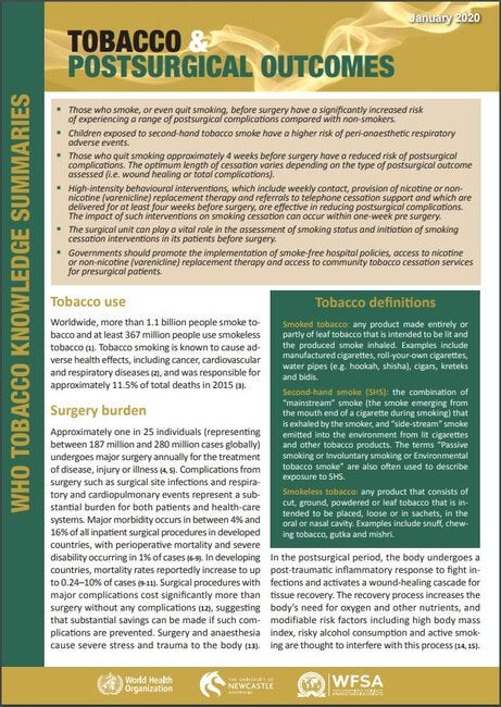 This document is the fourth in a series of Tobacco Knowledge Summaries. This document was prepared with the objective to summarize the association between tobacco use and postsurgical complications, as well as describe the effectiveness of interventions to reduce presurgical tobacco use and tobacco-related complications. This is also intended as an advocacy tool to widely include health care professionals in the fight for tobacco control and prevention of tobacco-related adverse health effects.