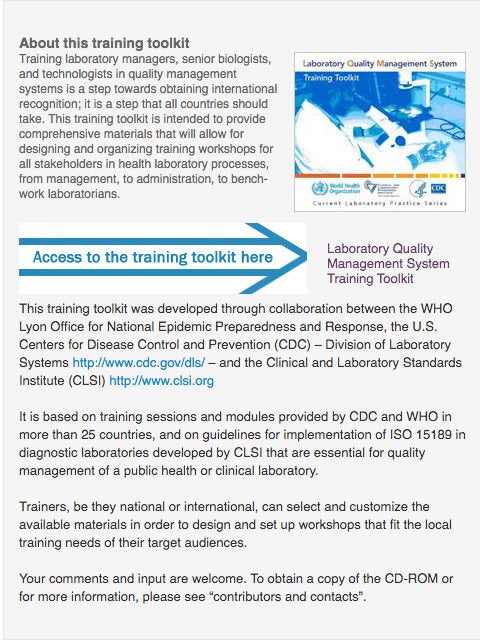 Training laboratory managers, senior biologists, and technologists in quality management systems is a step towards obtaining international recognition; it is a step that all countries should take. This training toolkit is intended to provide comprehensive materials that will allow for designing and organizing training workshops for all stakeholders in health laboratory processes, from management, to administration, to bench-work laboratorians.
